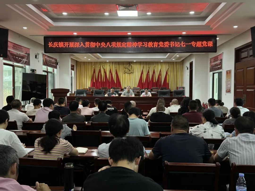 为持续推动全面从严治党向基层延伸,在“七一”建党节来临之际,长庆镇组织开展“书记讲党课”活动。镇党委书记邱飞尧以“严格落实中央八项规定精神”为主题,为全体党员干部讲授专题党课,重点引导大家增强纪律意识和作风意识。镇机关全体干部职工、各村党支部书记及驻村第一书记等同志参加此次活动。 邱飞尧书记带头领学了习近平总书记关于全面从严治党重要论述摘编、《中央八项规定实施细则》等内容,组织党员集中观看警示教育片《警钟长鸣》,通过典型案例开展反面教材学习,引导党员干部以案为鉴、警醒自律,强化纪律规矩意识。 邱飞尧书记强调讲话