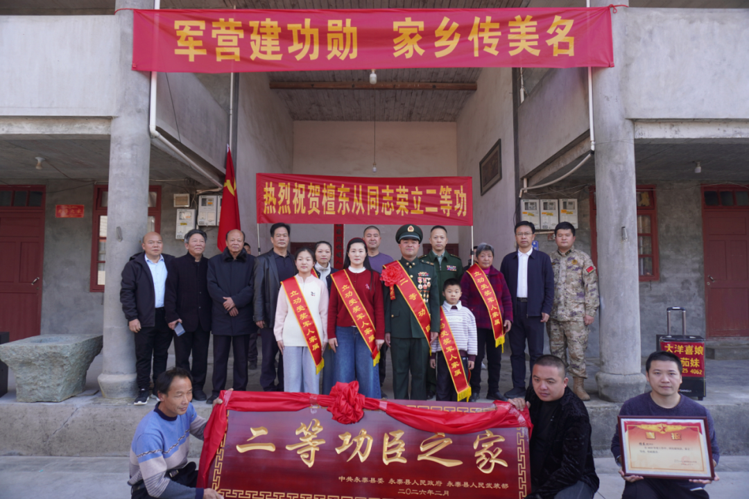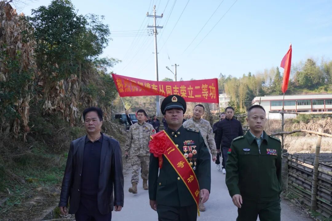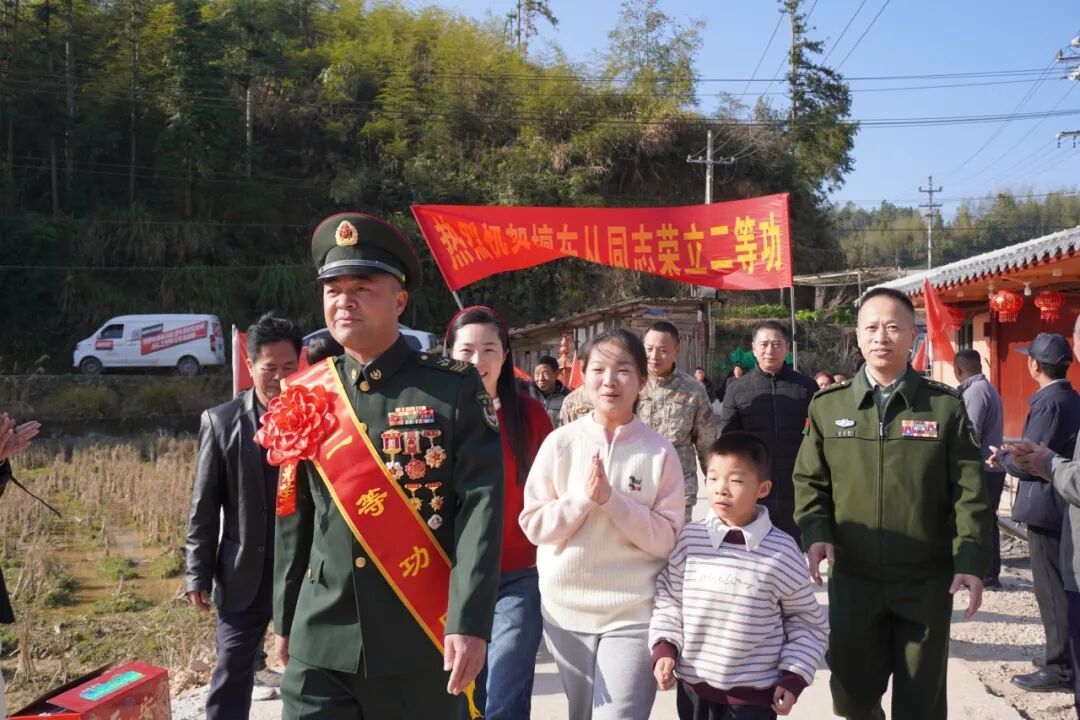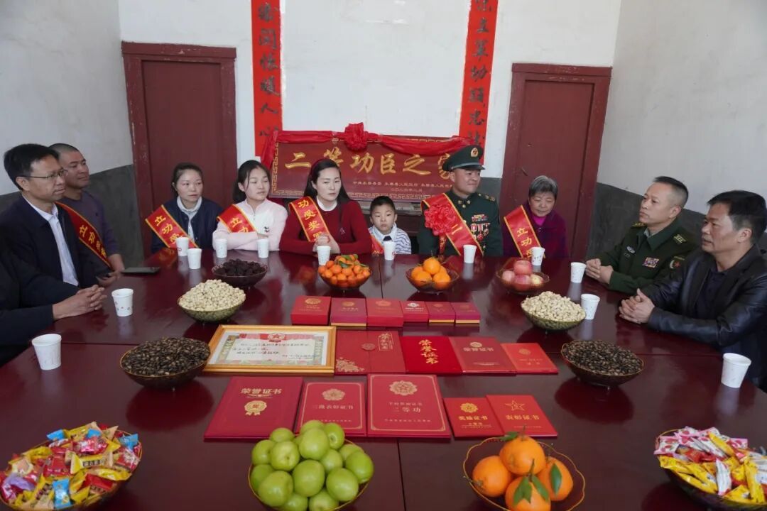 县人武部上校政治委员温文祖参加活动 活动现场 锣鼓喧天、鞭炮齐鸣 慰问组一行将镌刻着 “二等功臣之家”荣誉牌匾送至檀东从家中 并为他及家属佩戴上鲜红的绶带 向他们致以热烈祝贺与崇高敬意 慰问组一行还与军属深入交谈 详细询问家庭生活状况 对檀东从在部队的拼搏奉献、 家属长期以来的默默支持表示衷心感谢 邻里乡亲也闻讯赶来道贺 共同见证这份属于军人家庭的高光时刻